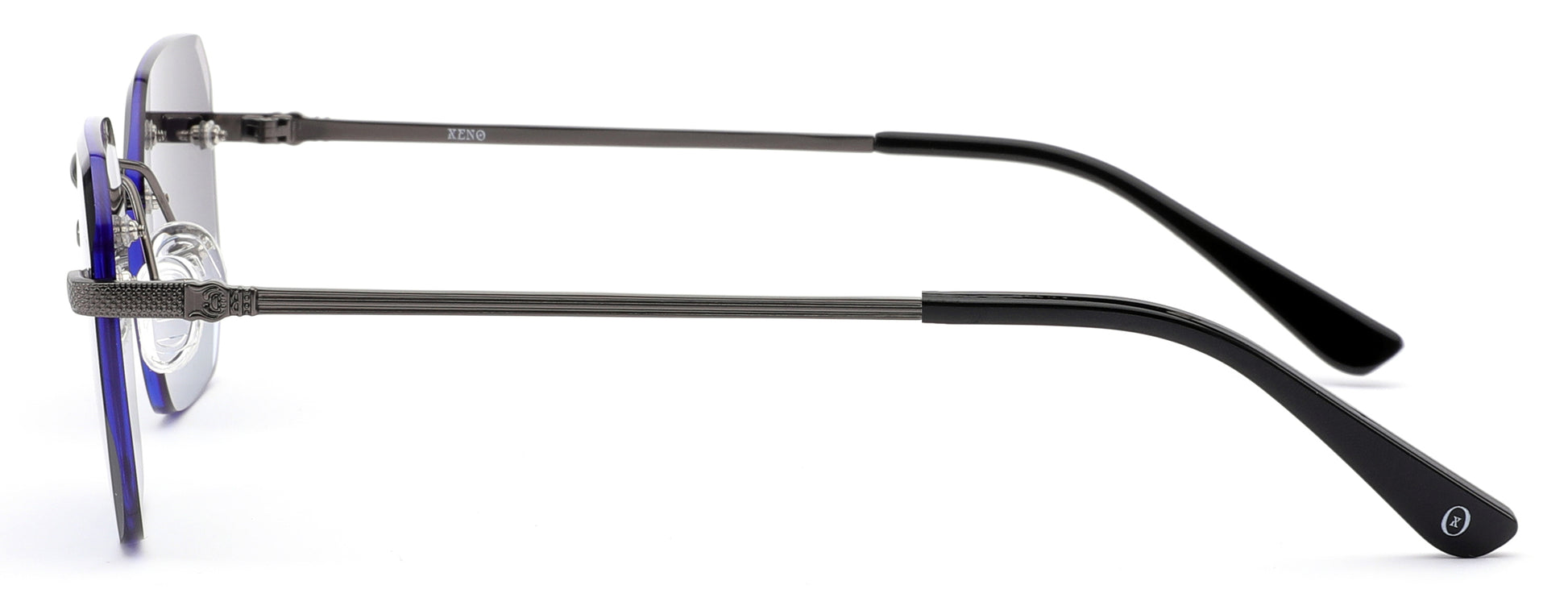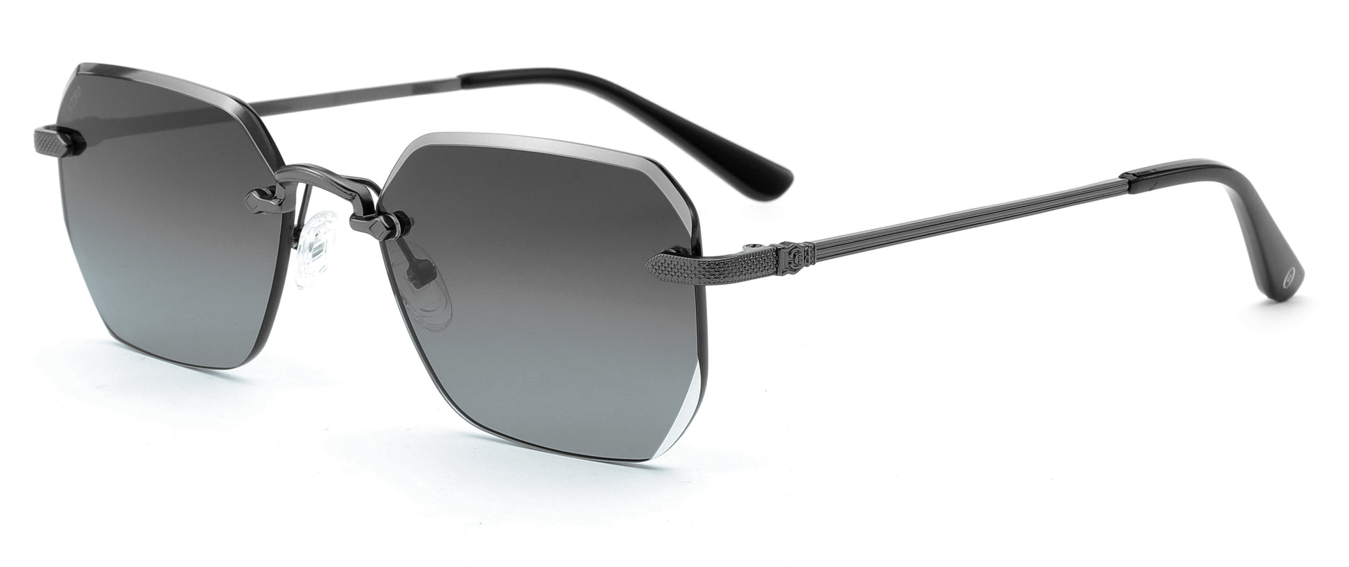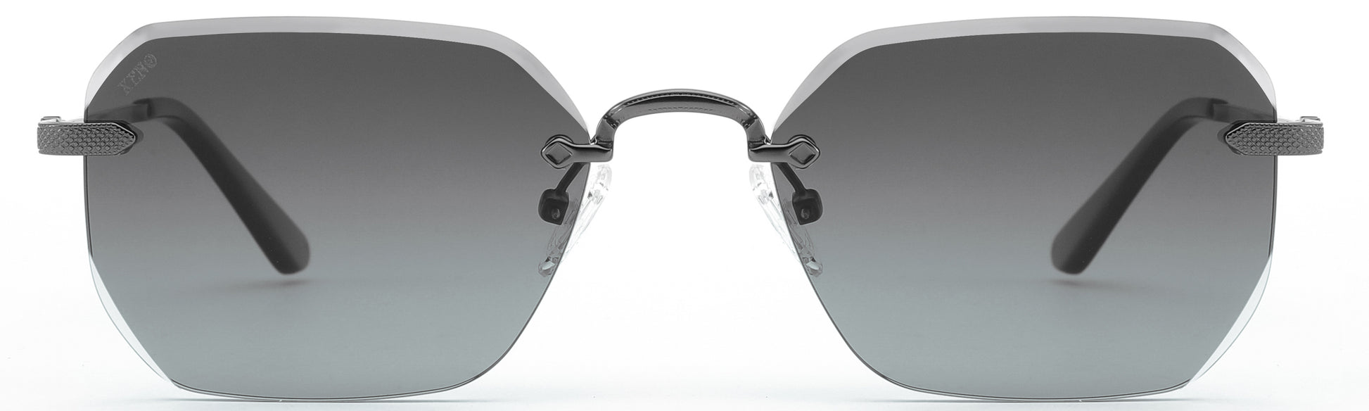 The XENO Type 02 in Obsidian Edge features a frameless design with deep charcoal gradient lenses and precision-cut hexagonal edges that redefine sharp. Finished with dark titanium temples and textured detailing, these sunglasses fuse luxury with quiet power.