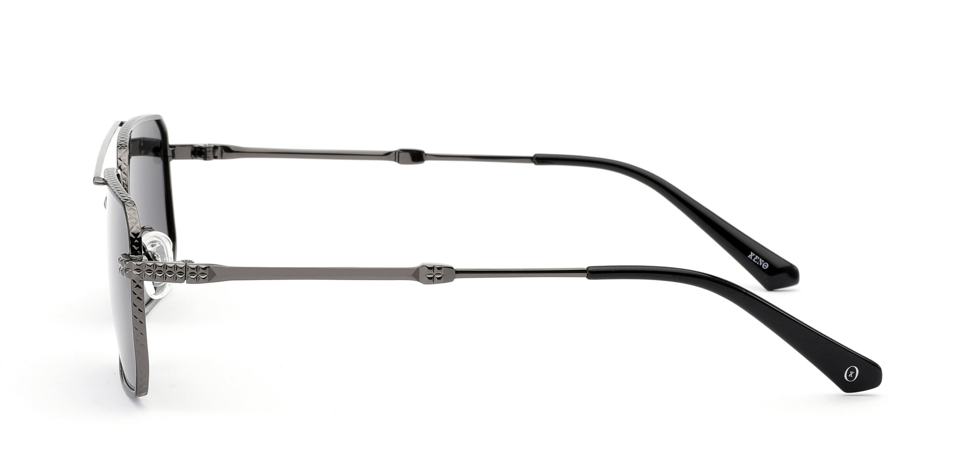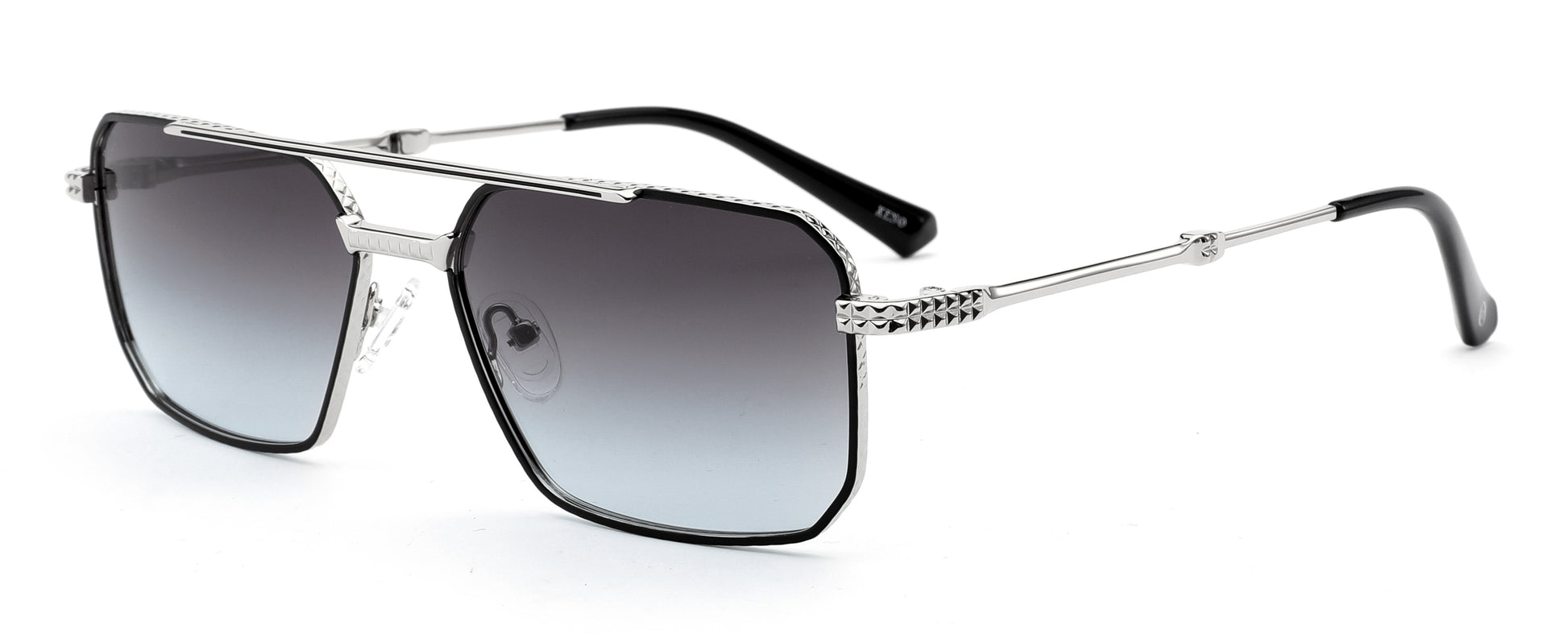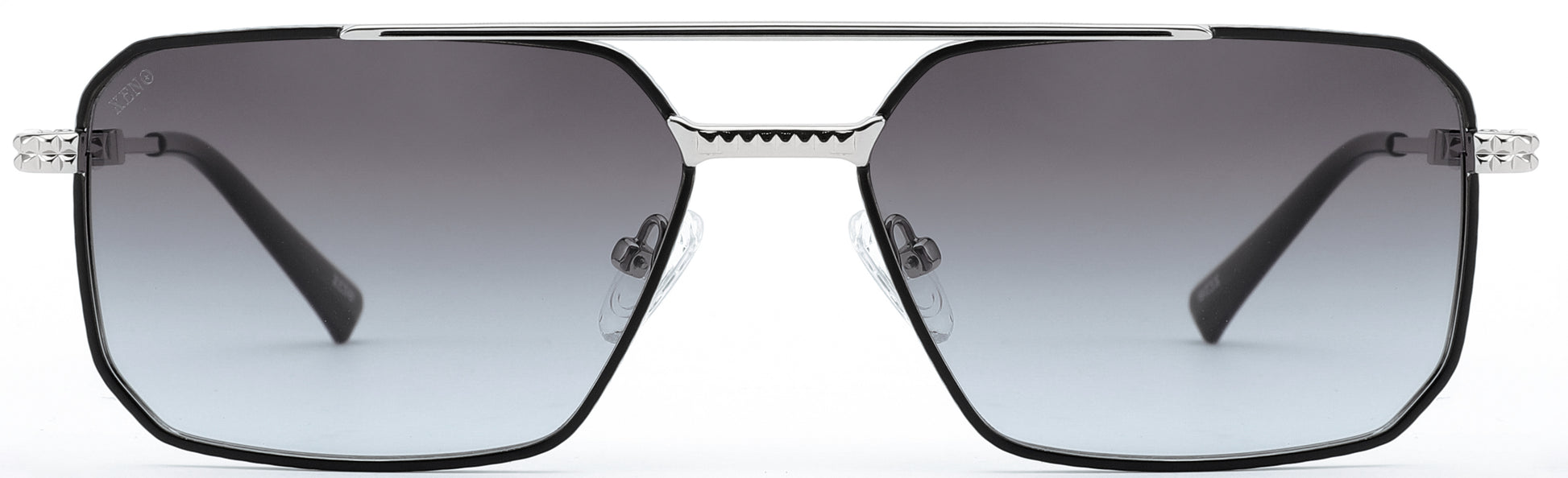 Cool-toned precision at its finest. Xeno Titan Edge in Silver Sunglasses frames an angular square silhouette with a crisp gradient lens and polished silver hardware. Finished with sculpted texture at the temples and a notched mid-bridge, this piece speaks clarity, structure, and full-spectrum confidence.